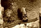 Large hippopotamus resting at the water's edge of a zoo enclosure with small ducks walking nearby. Concept of wildlife observation, zoological parks, and animal coexistence.