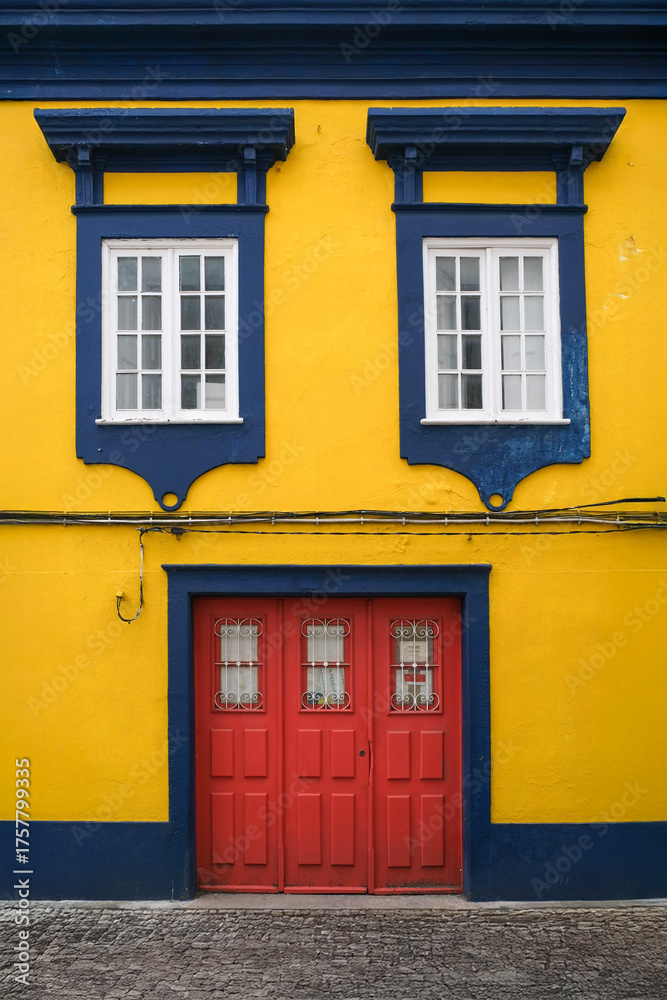 Colorful facade of a building with bright yellow walls, blue window frames, and a red door, showcasing vibrant architectural contrast and urban charm
