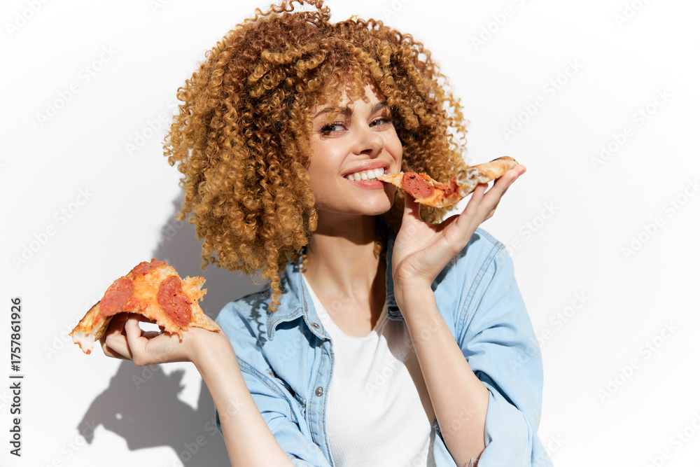 Young woman with curly hair enjoying pizza, showcasing joy and indulgence while dressed casually in a denim jacket against a clean white background