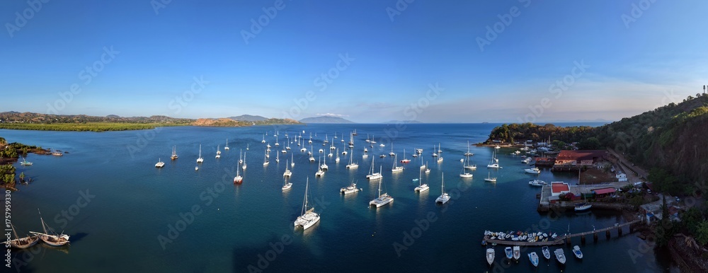 Panoramic shot. Harbor full of boats near the crater in Ambatoloaka