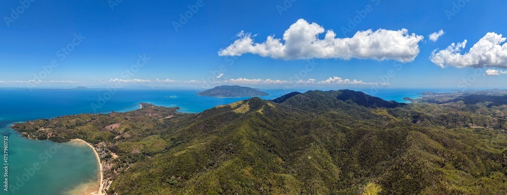 Aerial 180° panorama of Lokobe Park, Nosy Be, Madagascar – lush tropical rainforest, dense greenery, and pristine nature from above.