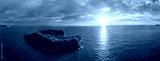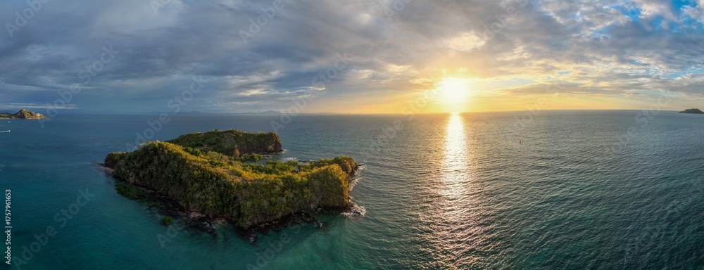 Panoramic 180° sunset drone view of Tanga Island, Nosy Be, Madagascar – golden light over turquoise lagoon, tropical beaches, and lush island vegetation.