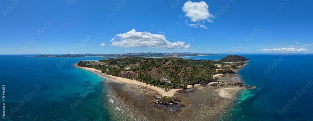 Aerial 180° panorama of Sakatia Island, Nosy Be, Madagascar – turquoise sea, white sand beach, palm trees, and tropical paradise in the Indian Ocean.