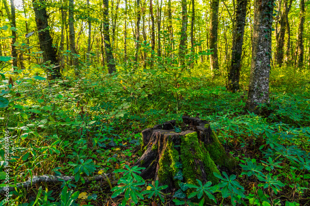 An old stump covered with green moss in the forest