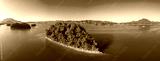 Aerial view of the beautiful lake with green forest islands natural landscape in the morning. Famous Qiandao Lake scenery in Hangzhou, China.