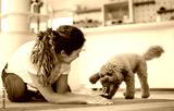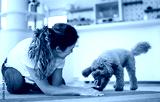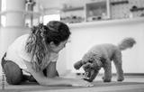 Cute dog enjoys love from owners at home. Couple pets and cares for furry friend, creating a bond.