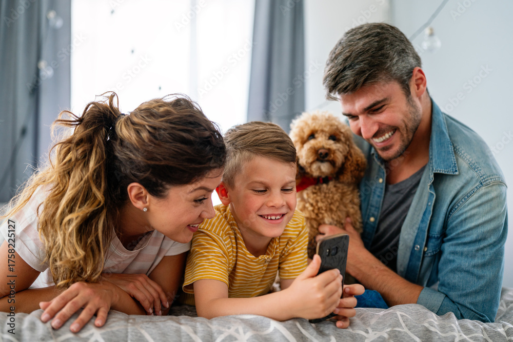 Family from three people cheerfully spends fun time at home together. Parents, kid happiness concept