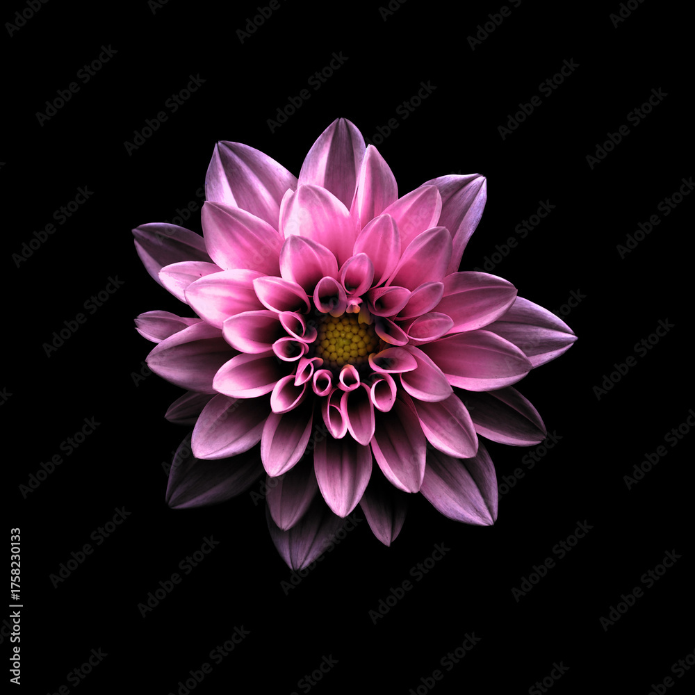 Surreal dark chrome violet flower dahlia macro isolated on black. Detailed flower photo. Invitation, celebration, love, congratulation, sale, festive card concept