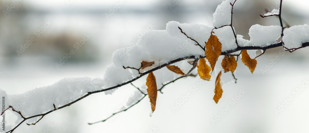 Bare tree branch heavily covered with caps of fresh white snow, with a few dry orange leaves clinging to it, on a blurred winter background creates a cold and transitional natural scene