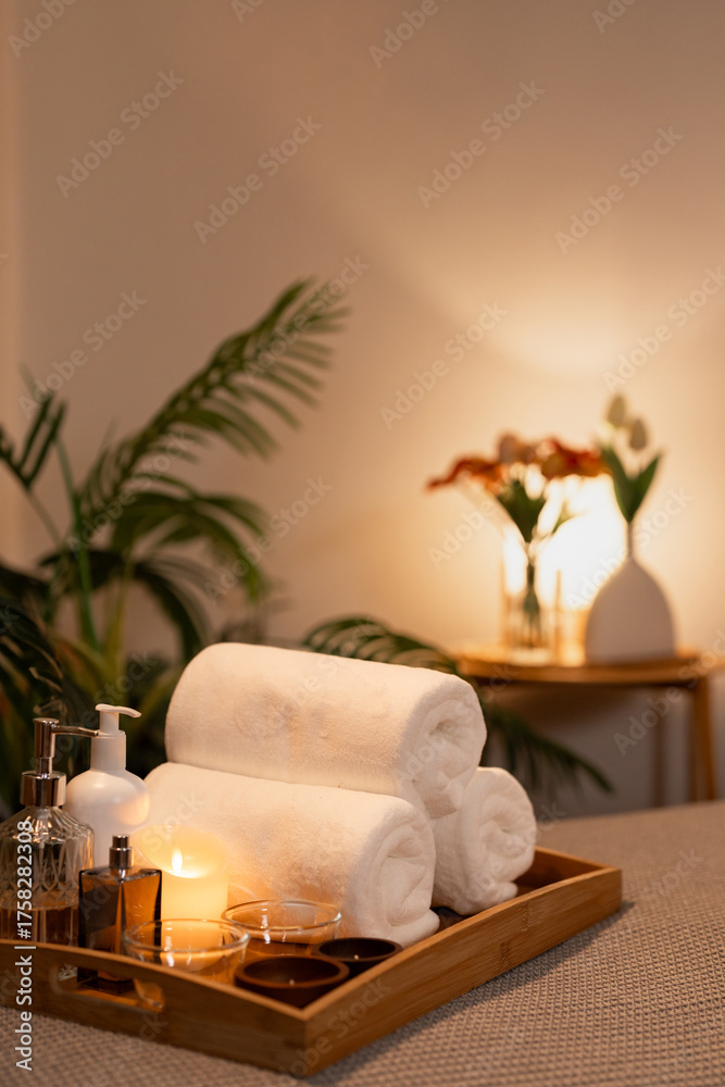 Spa relaxation essentials tranquil atmosphere wellness products therapeutic treatment setup warm ambiance perfect for serene pampering