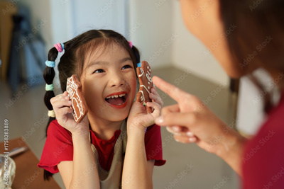 Gingerbread Delight. Child joyfully presenting decorated cookies during holiday baking.