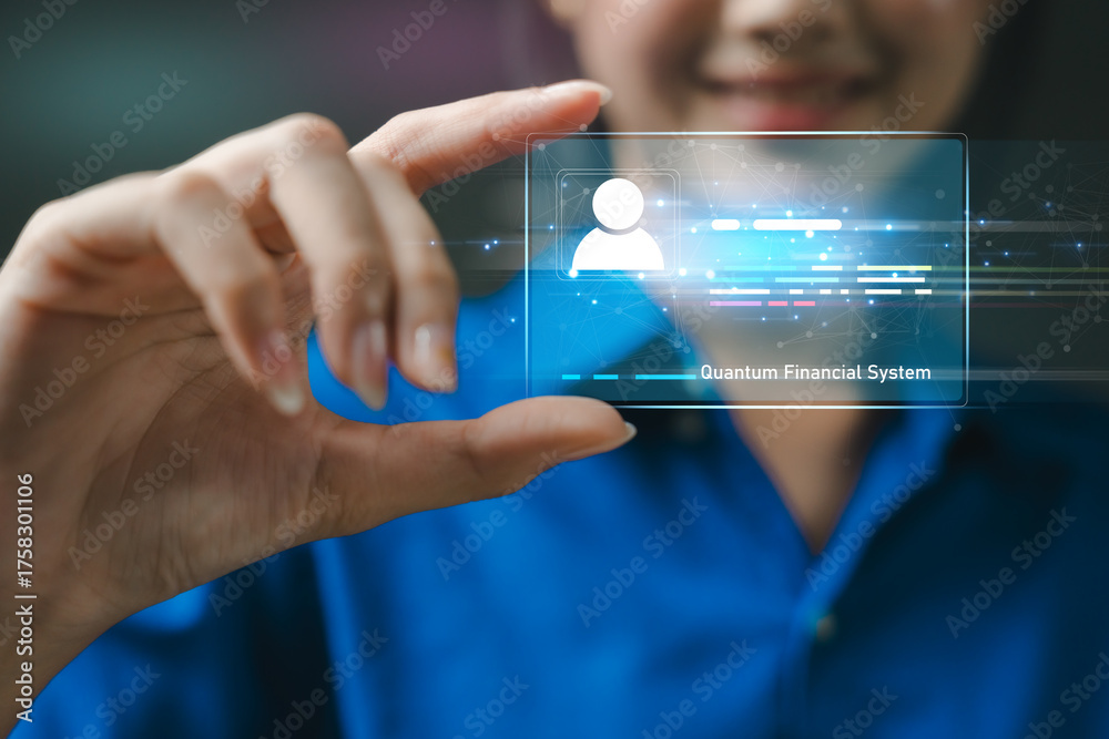 QFS digital identity concept. ID card displaying verified digital identity for the Quantum Financial System, QFS, blockchain, Concept of secure, modern fintech and blockchain authentication.