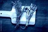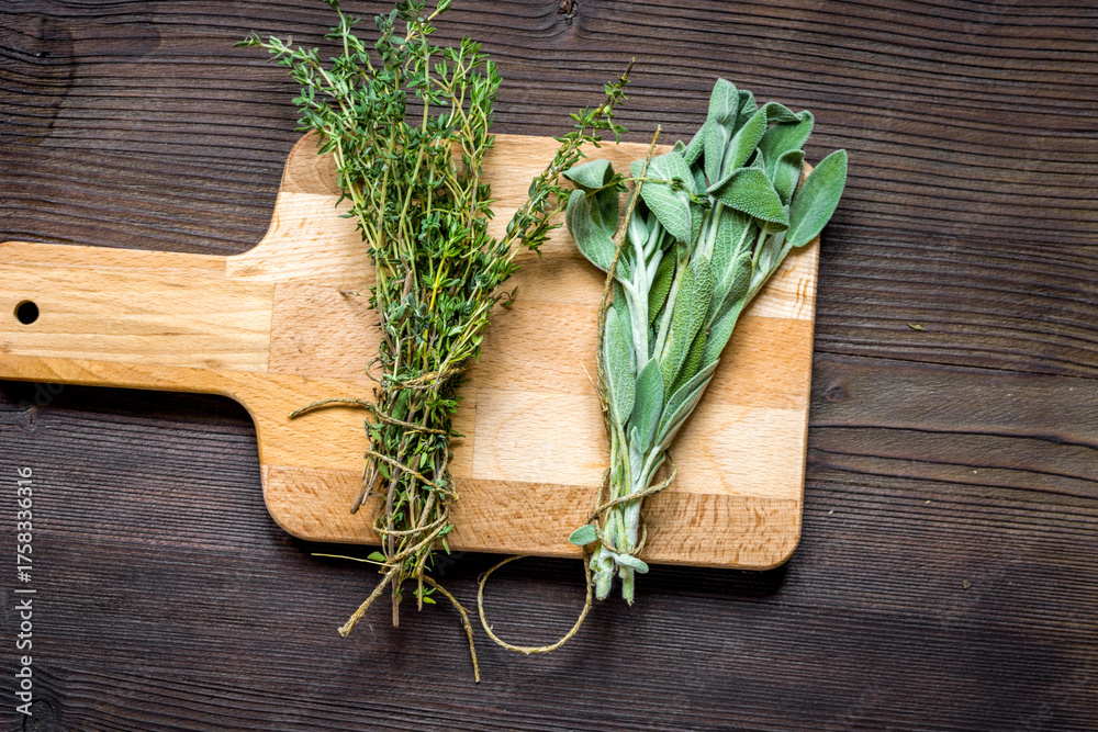 bundle of sage and thyme on wooden board top view