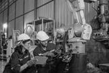 Blue collar workers at machine shop with welding robot arm.