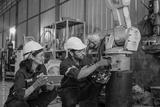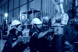 Blue collar workers at machine shop with welding robot arm.