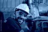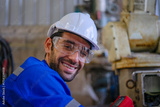 Blue collar workers at machine shop with welding robot arm.