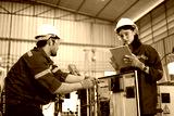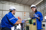Blue collar workers at machine shop with welding robot arm.