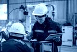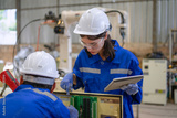 Blue collar workers at machine shop with welding robot arm.