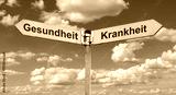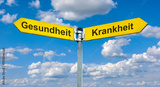 Zwei Wegweiser zeigen in unterschiedliche Richtungen und sind beschriftet mit Gesundheit und Karankheit - FOTOMONTAGE