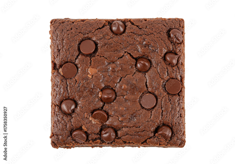 Isolated decadent homemade chocolate brownie with chips for dessert or tasty snack meal