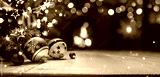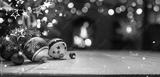 A Christmas Tree with Balls in the Foreground and Snowflake Symbols. Fireplace. Red Lights and a Bright Garland with Stars. Light Wooden Background