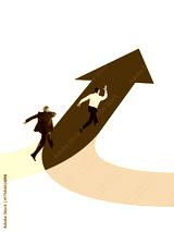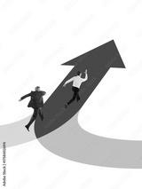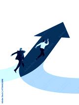 Bold colorful poster. Businessmen running upward along colorful arrows. Concept of motivation, leadership, strategic movement in corporate, technology, and startup growth visuals.