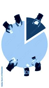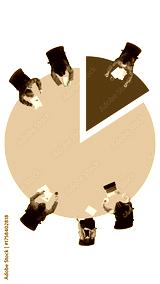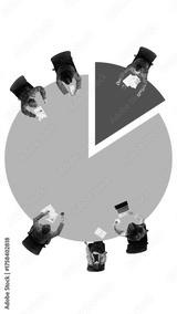 Collage made of 4 models. Business team sitting around pie chart representing data distribution and cooperation. Concept of teamwork, corporate training, startup analytics, and leadership education.