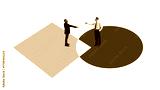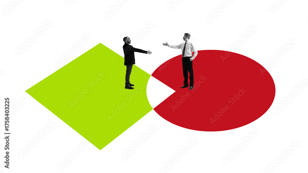 Collage art. Businessmen shaking hands across abstract red and green shapes symbolizing agreement. Concept of diplomacy, partnership, technology presentations, and negotiation visuals for fintech.