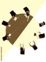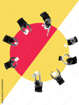 Creative collage of business team working around red and yellow circle. Concept of collaboration, brainstorming, teamwork for startups, corporate training, and education visuals. Made of 4 models