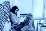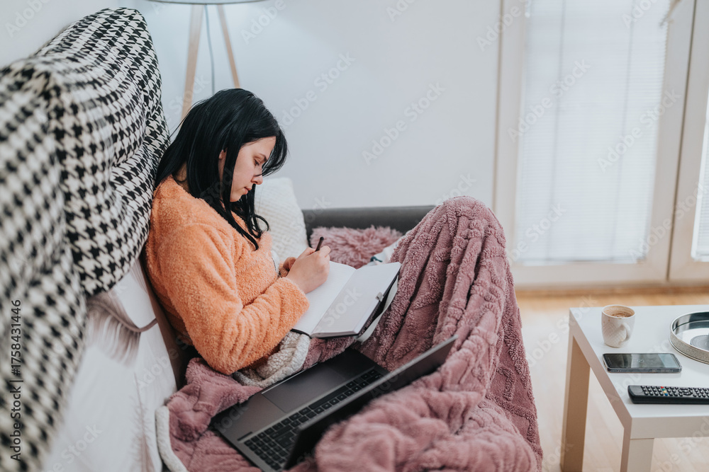 A young woman writing in a notebook while relaxing on a sofa in comfort