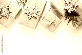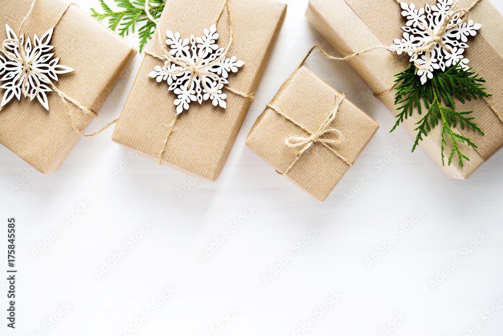 Christmas and New Year holiday background. Xmas greeting card. Christmas gifts on white wooden background top view. Flat lay