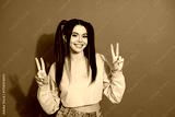 Smiling young woman with pigtails in a lime crop top showing peace gestures against a vibrant purple background