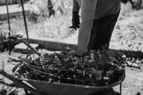A person in gloves stands beside a wheelbarrow filled with dry leaves and twigs in a sunny backyard, ready to clear debris and tidy the garden. Outdoor work and home landscaping.