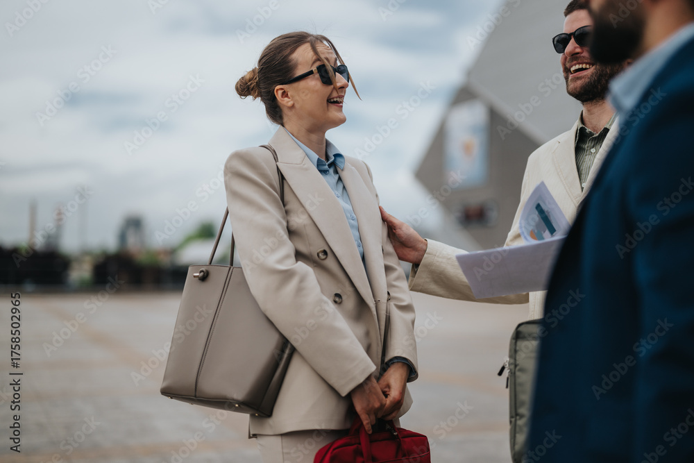Professionals enjoy a lighthearted moment while discussing business documents outdoors on a clear day.