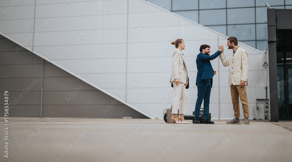Business professionals meeting and greeting outside in a contemporary urban setting