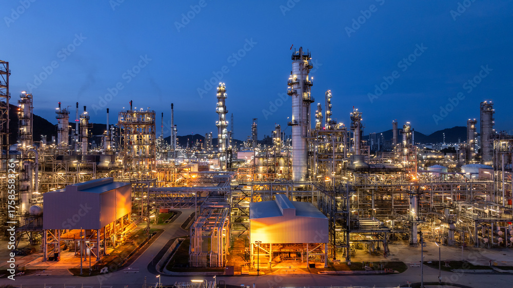 Oil and Gas refinery plant at night, Global business energy logistic transportation, Oil and gas refinery petrochemical industrial, Petrochemical refinery industrial energy supply chain.