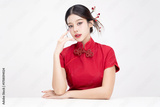 Elegant Asian woman wearing a traditional red cheongsam with stylish makeup, neat hairstyle, and festive. Her outfit modern traditional charm perfect for beauty, fashion, or Chinese New Year.