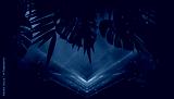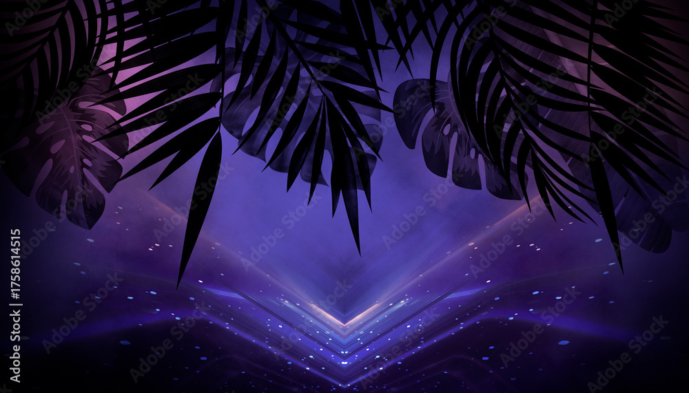 Silhouettes of tropical leaves empty scene background, abstract multicolored neon lights.