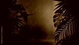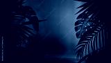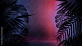 Silhouettes of tropical leaves empty scene background, abstract multicolored neon lights.