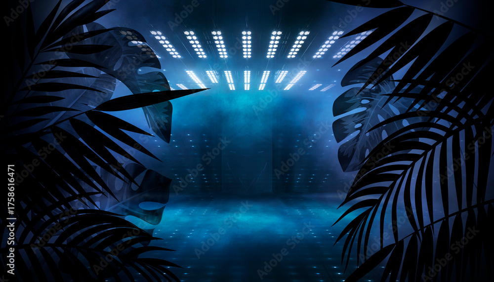 Silhouettes of tropical leaves empty scene background, abstract multicolored neon lights.