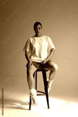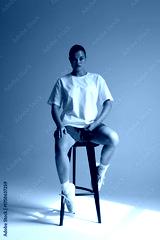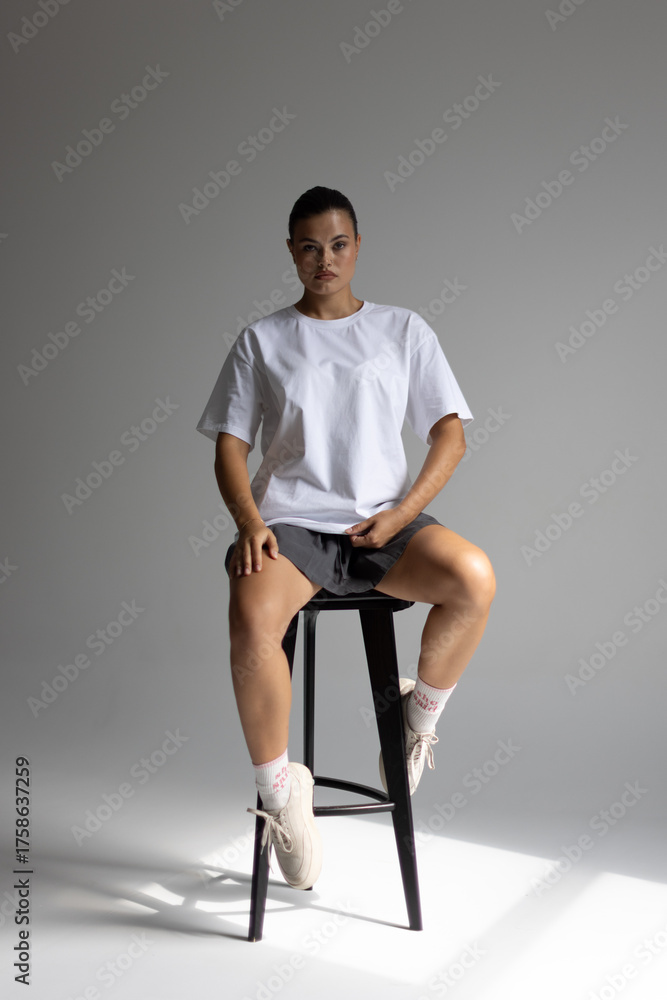 thoughtful female model with soft lighting, relaxed female model seated with soft directional light
