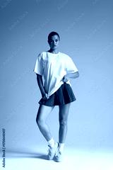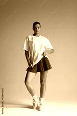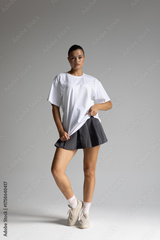female model exudes assertive energy while casually posing in minimalist studio environment