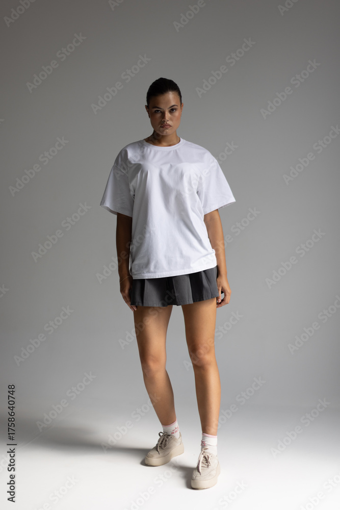 female model wearing white tshirt with relaxed pose against neutral background highlighting casual
