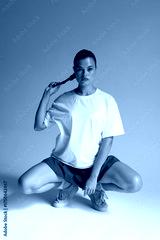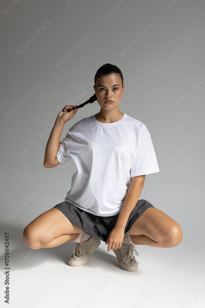 athletic female model demonstrating power, female model in athletic stance showcasing motion