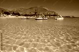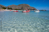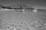 Sunny day on seaside vacation destination, Mondello Beach, near Palermo in Sicily with fine, golden sand, turquoise waters and charming villas, South of Italy