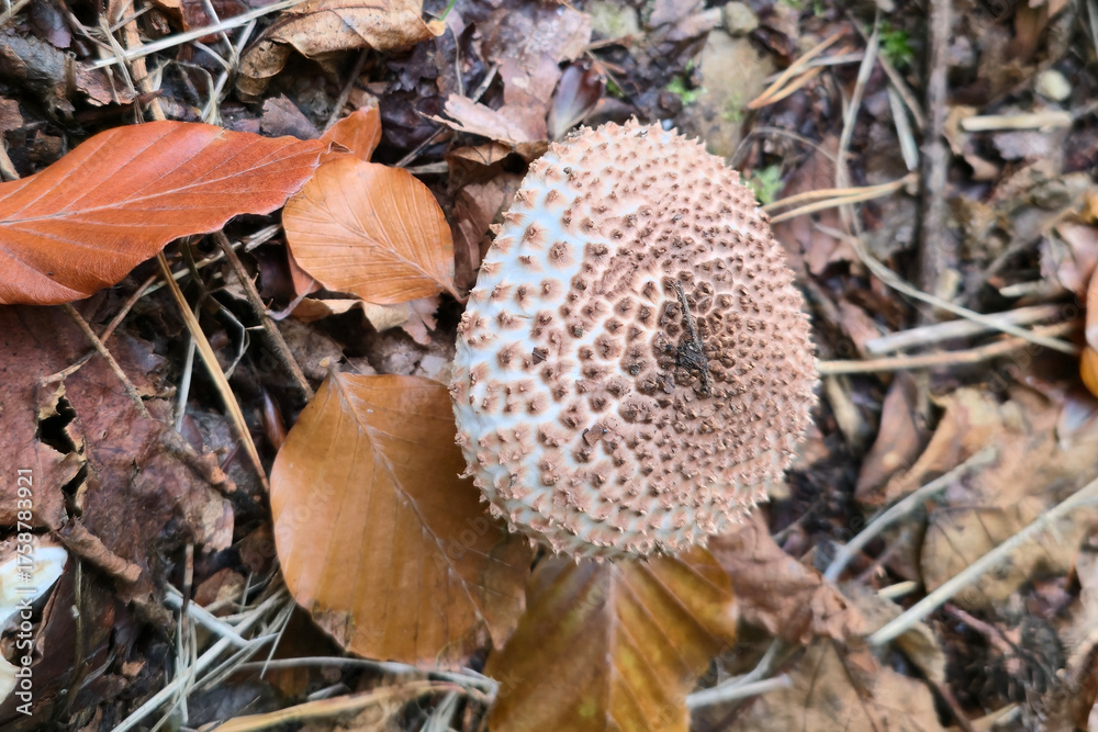 Close-up of a pointed-scaled spiny umbrella mushroom