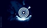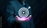 Businessman holding a glowing digital target with arrow symbolizing business success, goal achievement, and precision marketing strategy. Focus, leadership, and innovation in business.