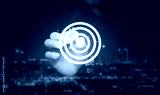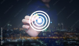 Businessman with a dart touching glowing digital target icon over city background. Business vision, goal setting, and digital innovation. Ssuccess, leadership, and strategic planning.