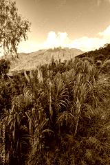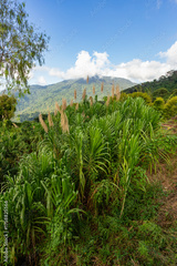 Foreground of tall, lush tropical grasses and Pampas plumes against the backdrop of the Sierra Nevada mountains near Minca, Colombia.