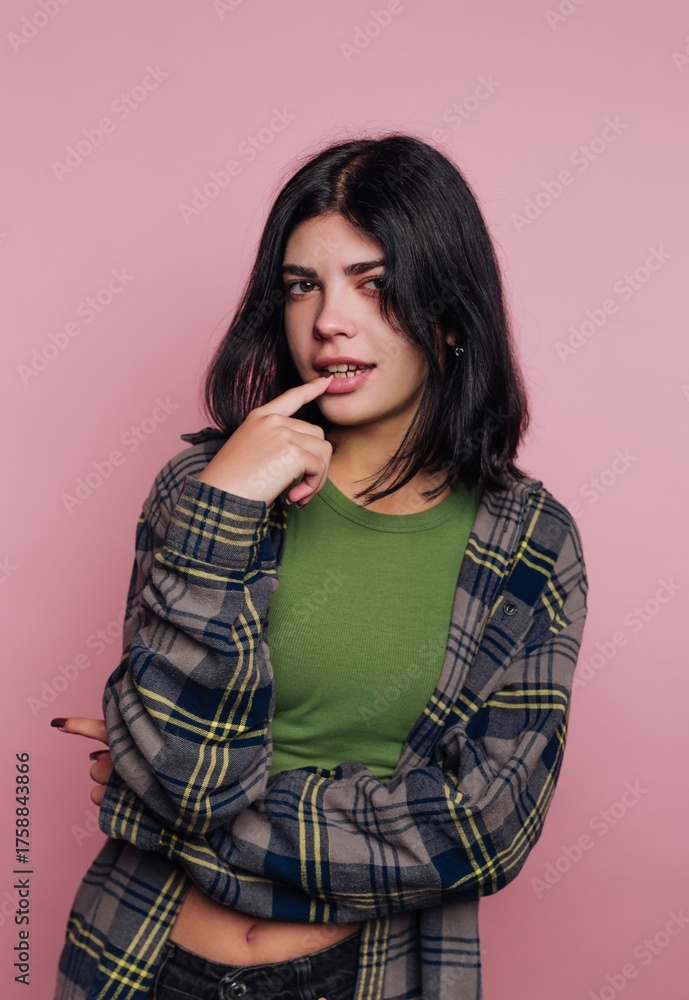 Young woman in casual outfit poses with playful expression against a soft pink backdrop while showing confidence